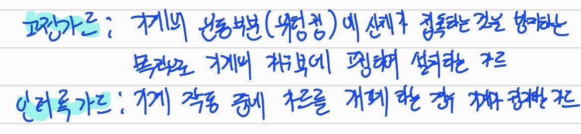- 인터록가드: 기계 작동 중에 가드를 개폐하는 경우 기계가 정지하는 가드